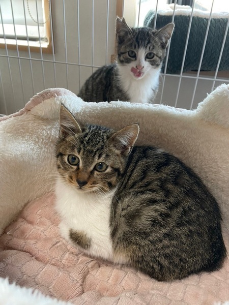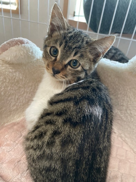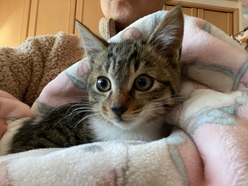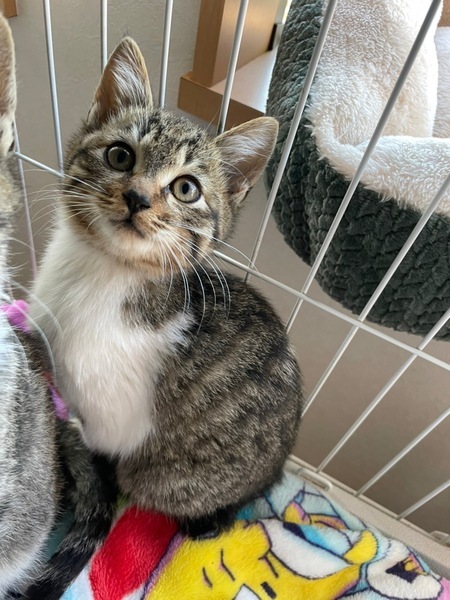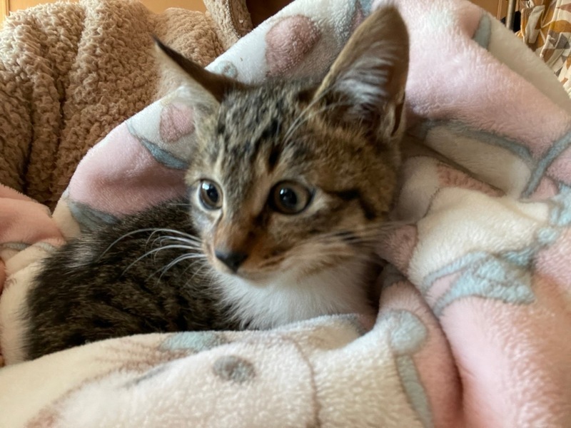 | 特徴(性格など) | 顔と背中はキジトラ、お腹と脚は白いです。 尻尾は短めのシマシマ、先だけカギ尻尾。 先に保護したてんぐの兄弟です。 抱っこされると気持ち良さそうにし、猫じゃらしでよく遊びます。 |
