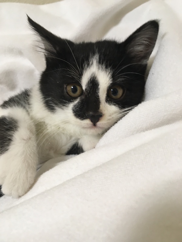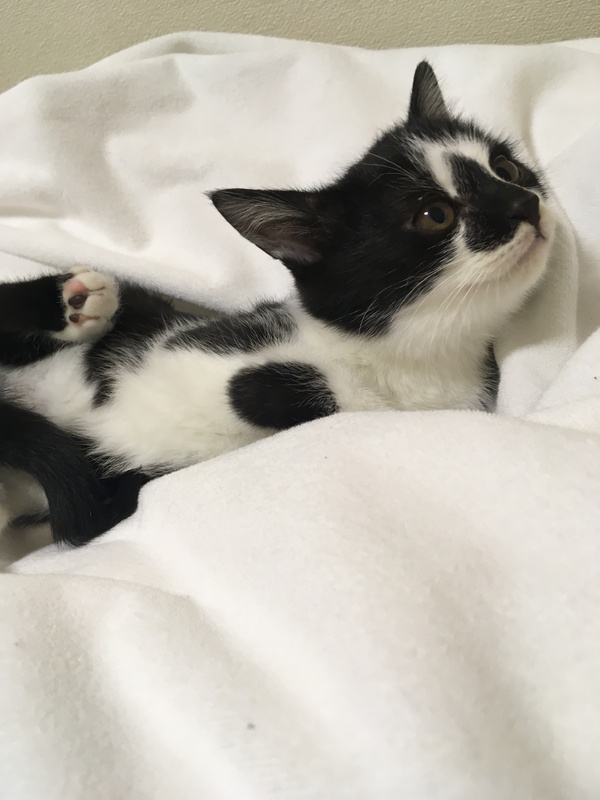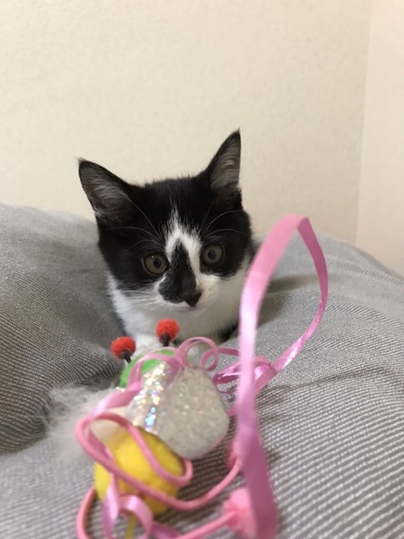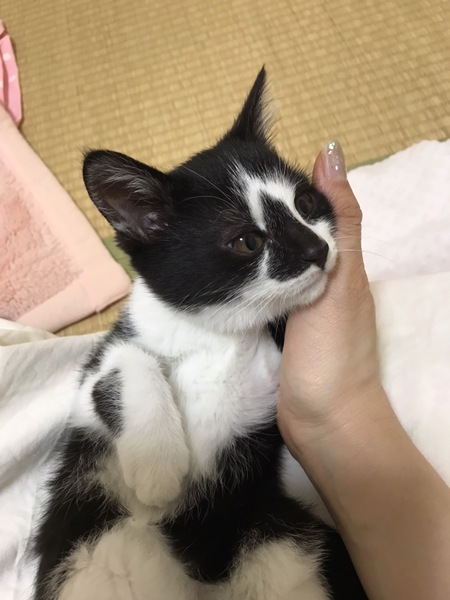 | 特徴(性格など) | 12/11時点体重1.0キログラム。 健康状態は良好です。 ノミダニ駆虫済。 コアラみたいな模様がチャームポイントのハチワレ猫です。 しがみついてくるので、抱っこ好きになりそう。でも降ろすと逃げ足は兄弟の中で1番です。 |