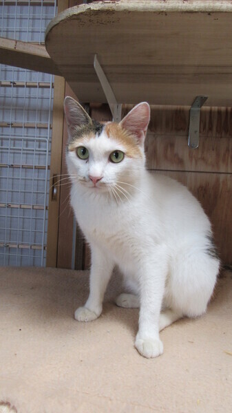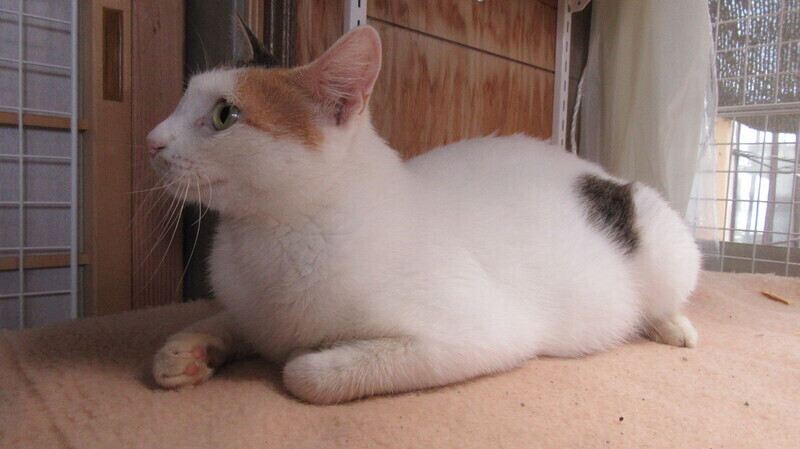 | 特徴(性格など) | 体は白で頭としっぽが三毛 保護時は人に対して警戒心が強かったですが、今ではすっかり懐いてくれて自分から甘えてくるまでになりました。おしりをポンポンしてあげると喜びます。 狭いケージが苦手なので、室内で自由に生活しています。 とてもおとなしい子です。 |