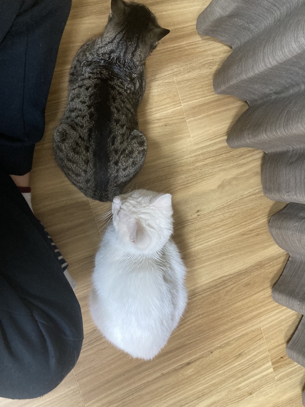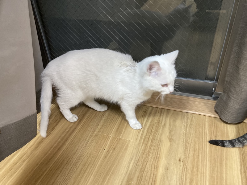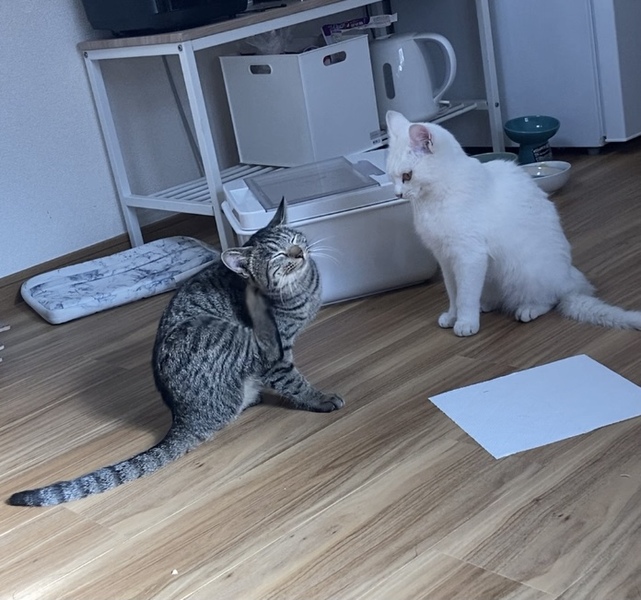 | 特徴(性格など) | 白猫(オス) キジトラ(メス) 2匹とも推定生後半年ほどの子猫です。 元野良猫ですが、ご飯を何度かあげたりしていたため人を怖がったりしている様子はあまりありません。 2匹ともご飯を手から食べてくれたり撫でたらゴロゴロ言います。抱っこも少しですがさせてくれます。2匹とも元野良にしては甘えんぼな方だと思いますが特に白猫の方が甘えんぼです。 |