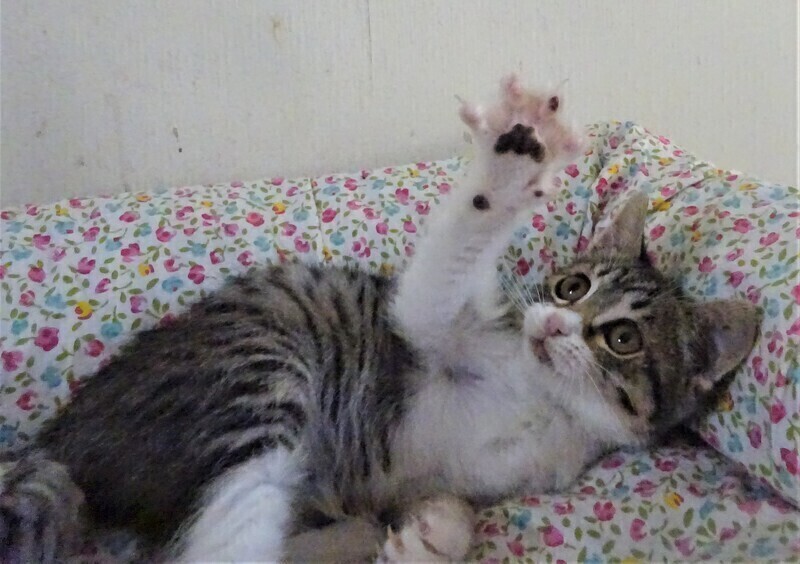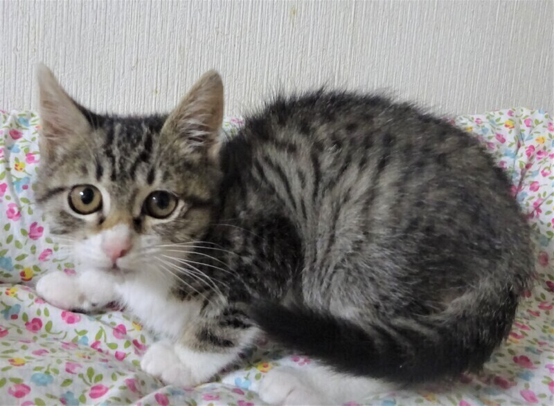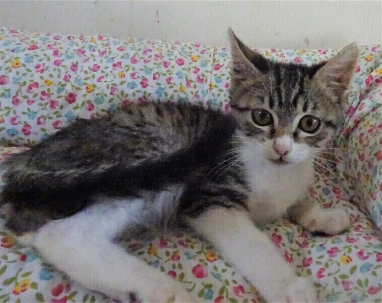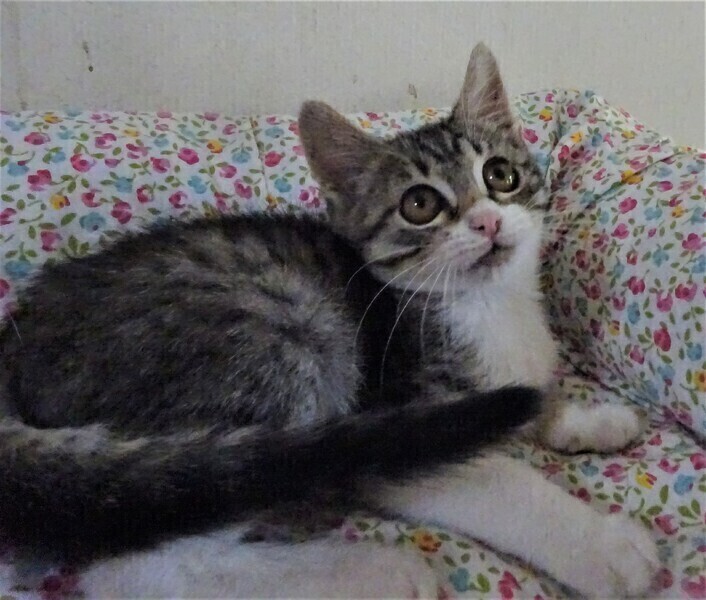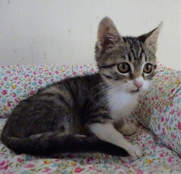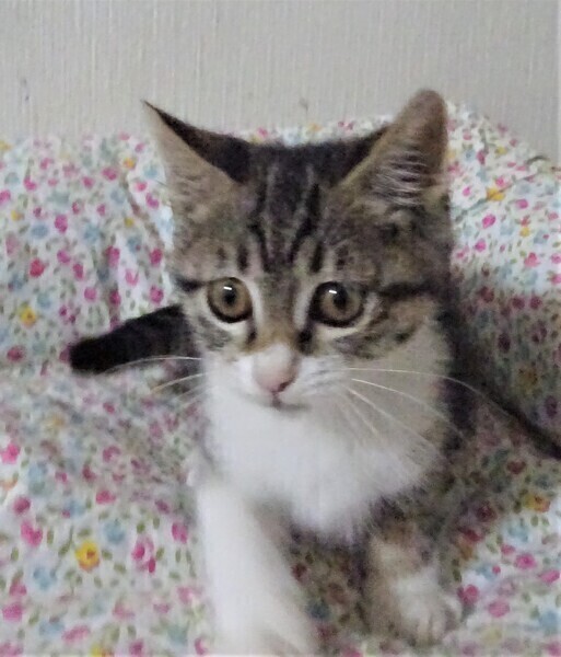 | 特徴(性格など) | 仮名: 元子ちゃん(メス) 毛色: キジ白、尻尾長い 性格: 月齢よりは小さめです。 生後2日目に来て、2か月もミルクで育ったので、人馴れはしています。 何度も生死を彷徨って生き延びましたが、小さいですし、その間、他猫とも遊んでいなかったので、今やっと遊べるようになり猫社会の学習をしていると思います。 今は、他の子猫や中猫、成猫と一緒に過ごしていますので、先住猫がいるお家でも大丈夫と思います。 |