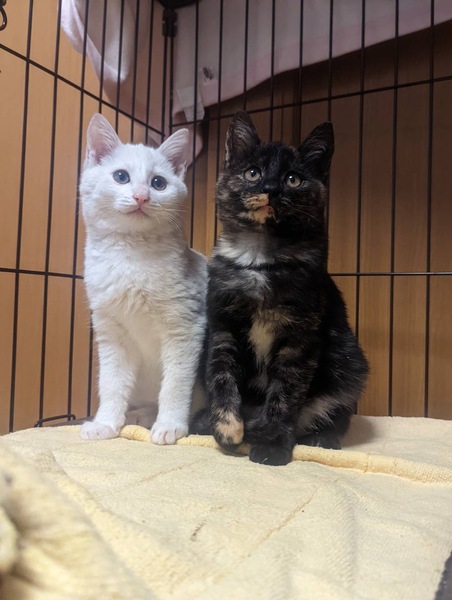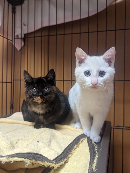 | 特徴(性格など) | 白猫:オス 臆病・だいぶなれてきました! さび: メス 活発・甘えん坊 |