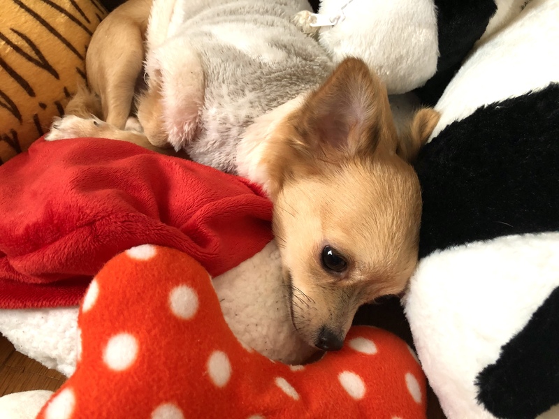 | 特徴(性格など) | 色はレッド&ホワイト(茶色)です。 性格は人懐こく甘えん坊です。 人が側にいて安心できる状態であれば無駄鳴きする事はありませんが、1人になると不安になり鳴いてしまいます。 食べることが好きで、今の時期はさつまいもやみかんを見ると立って喜びます。 寒がりなのでコタツの中に入ったり、ヒーターの前で温まっています。 洋服を着るのは好きみたいです。 お風呂も嫌がらずに入ってくれます。 |