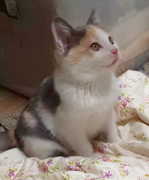 | 特徴(性格など) | ☆仮名 ふくちゃん ☆月齢 3ヶ月位 ☆毛色 三毛です。黒がややグレーなので全体にパステル調で柔らかい印象の毛色です。 ☆性格 とても懐こくて甘えん坊です。 |