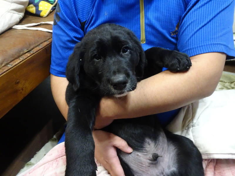 | 特徴(性格など) | 父親ゴールデンレトリーバー、母親シェパードMIX。 大型犬になる可能性大。生後2か月で8㎏超えています。 毛色黒、短毛1頭長毛2頭の可能性。顔つきはゴールデンです。 性格はゴールデンの人間好きがよく現れています。 |