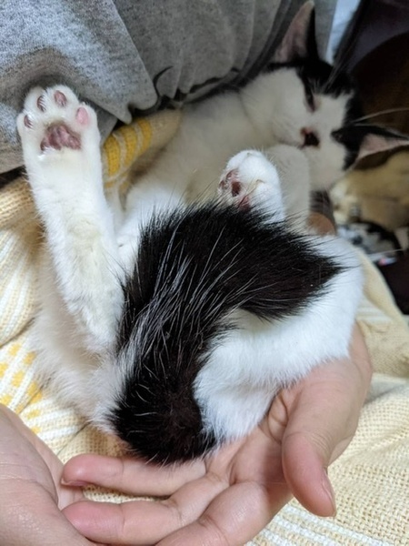| 特徴(性格など) | 抱っこしちゃえばおとなしい僕… 男の子・豆大福君・6ヶ月 【特徴】 丸顔で細い目の白黒 尻尾は微妙に短くて黒い 白に黒がポチポチ有るので豆大福♪ 【性格】 寂しがり屋 遊ぶの大好き 友達大好き 人には殆ど慣れてません。 優しい先住さんが居るお家か、仲良しとペアが希望です。 お留守番時間が少なくて沢山遊んてくれる里親様だと慣れやすいと思います。 1人だと野生化する可能性があります(笑) 甘えん坊と一緒が理想です。 |