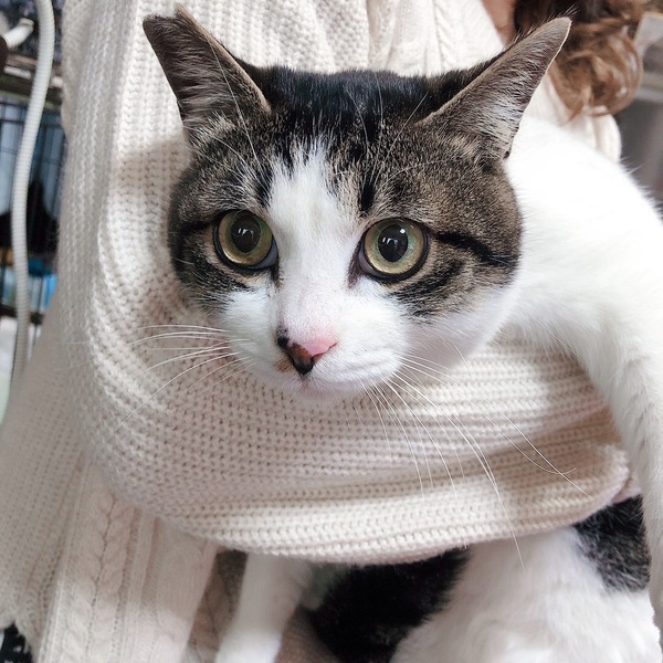 | 特徴(性格など) | 被り物もメガネも嫌がらない優男 男の子 【仮名】 ちび太 1歳半 【特徴】 キジシロ、目が大きい 【性格】 本当は甘ったれなちび太 長い期間お外で生活をしていたので、少し甘え下手です。 被り物やメガネをつけても嫌がらず、いい子に撮影会をさせてくれます♪ |