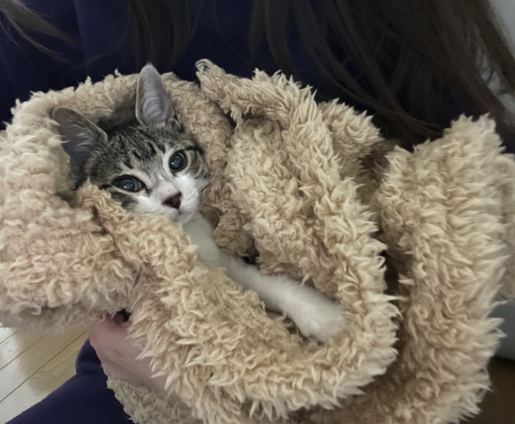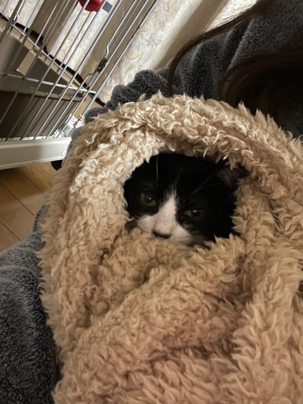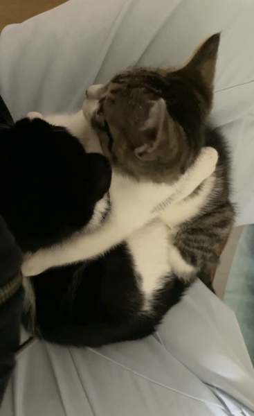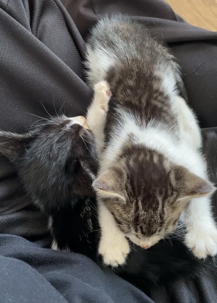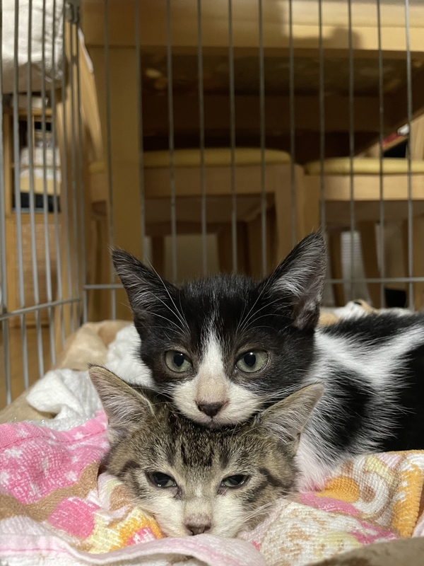 | 特徴(性格など) | 膝の上にのっかるのが大好きなキジ白の女の子、猫よりも人間が好きなようで保護したてでもゴロゴロ言いながら寄り添ってくれました。 人間より猫ちゃんが好きみたいでキジ白の女の子にずっとくっついて眠ったり傍からいなくなると鳴いてすぐに探してしまうほど甘えん坊なハチワレの男の子です。 2匹は同じ母親から生まれた兄弟です。 |