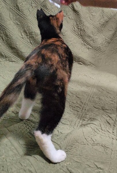 | 特徴(性格など) | 黒が多い三毛です。お腹側は白いです。 多頭飼育現場にいたので、他の猫とも問題なく暮らせます。抱っこされても大人しいです。 弟分のことを気にかけるお姉さん気質ですが、やんちゃな子達に押されて遠慮している様子です。 おしとやかなので、おだやかな大人の猫と一緒か、一匹で静かに暮らすのが向いているかもしれません。 まだまだ子供らしさもあり、猫じゃらし大好きで、元気に飛び回って遊びます。 |