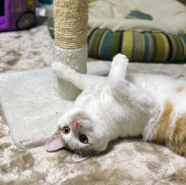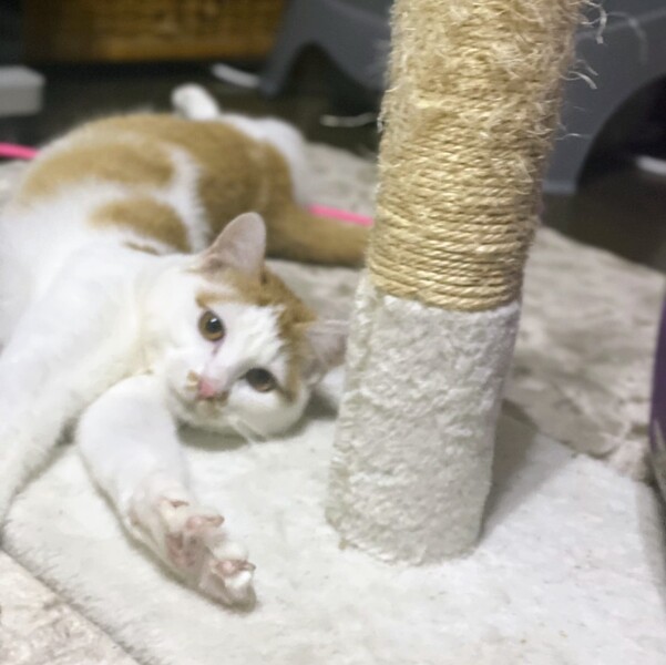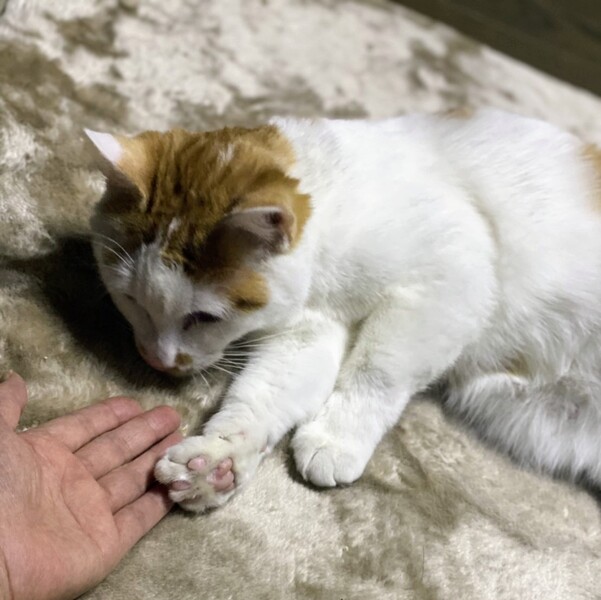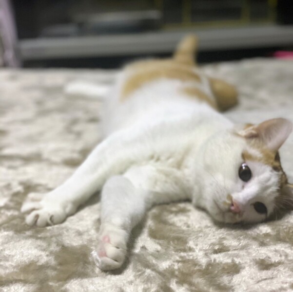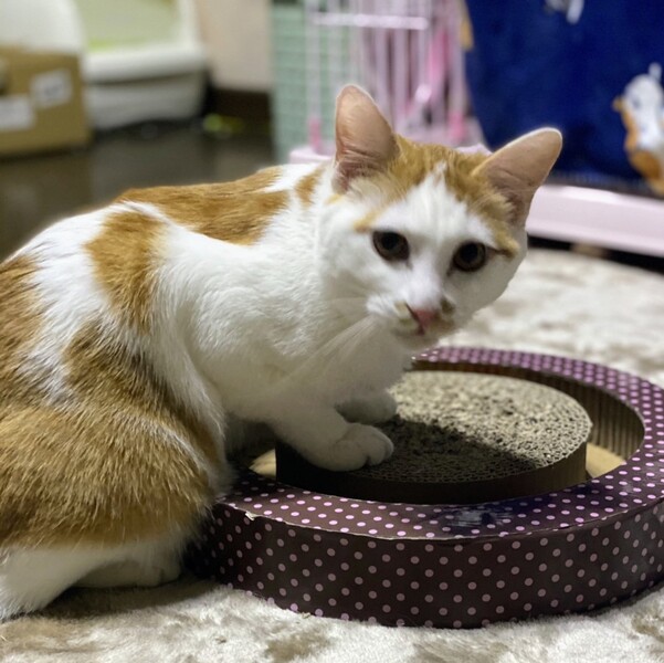 | 特徴(性格など) | 白が多めの茶シロ柄・以前はほっそり顔でしたが、幸せ丸顔・男の子 環境に慣れるまでそーっとしておく時間が必要です。 ちょっと怖がりさんですが、本当は甘えん坊でくいしん坊。 撫でて欲しい時やお腹が空いた時は、ゴロゴロ言いながらアピールします。 |