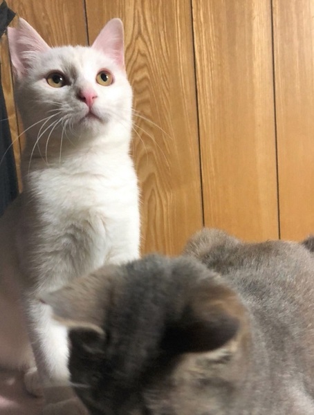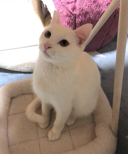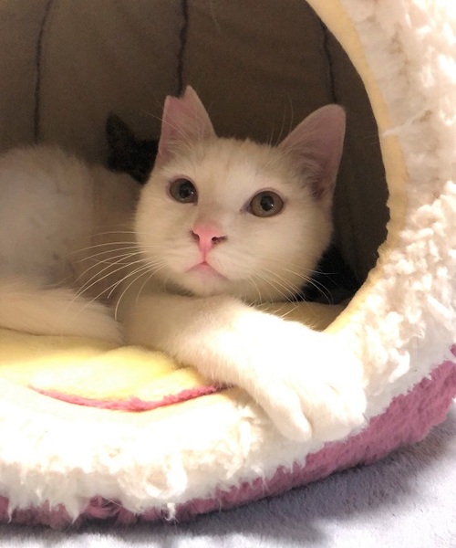 | 特徴(性格など) | 真っ白・鼻肉球ピンクの男の子 環境に慣れるまで少し時間が必要です。 移動して直ぐは怖がりののんきさん、現在は元気のんき者です。 撫でるとくるくる反転しバンザイをします。 ご飯の気配を察知すると、じーっとお皿の前からこちらを見続けていたりします。 |