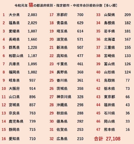 | その他(譲渡条件など) | ◆引き渡し方法について どうか温かい手を差し伸べて下さい。 尊い命です。 ※土日祝がお休みの為、お迎えは平日のみとなります、又、先着順譲渡されている場合もございますので必ず事前にご確認、一度こちらへご連絡宜しくお願い致します(^^) ⭐️県外、遠方の方でも良縁に恵まれましたら引き出しや空輸、搬送など出来る限りの範囲内になりますがボランティアがお手伝いさせて頂きます。ご相談下さいませ(^^) ⭐︎ご本人様確認の為身分証明書が必要となりますm(_ _)m ♡ご応募〜譲渡までの流れ♡ 【①〜⑰アンケートにご回答】 ⬇ 【身分証、ご連絡先のご提示】 【飼育環境写真のご提示】 ※ボランティアがお電話で譲渡誓約書や譲渡後についての確認などお話をさせていただきます ⬇ 【管理所職員の方とお電話で意思・条件などの最終確認】 ⬇ 【引き渡し】 搬送時にはエアトラベルキャリーケースかケージが必要になります。 搬送交通費、キャリーは里親様ご負担となります。 ☆尚、キャリーは無料貸し出しも可能でございます。 後日返送して頂きます。 ※譲渡後の幸せを真剣に願い、アンケートをお願いしております。↓お問い合わせ時にコピーペースト、もしくは番号順に箇条書きでも構いません。お手数ですが宜しくお願い致しますm(_ _)m お答え頂けない方、アンケート内容が曖昧な方へのお返事は致しかねますので予めご了承くださいませ。↓ ★★★★★★★★★★★★★★★★★★★★★★★★★★ ↓↓↓↓↓↓↓↓↓↓↓↓↓↓↓↓↓↓↓↓↓↓↓↓↓↓ ⭐️⭐️⭐️⭐️⭐️⭐️⭐️⭐️⭐️⭐️⭐️⭐️⭐️⭐️⭐️⭐️⭐️⭐️⭐️⭐️ ①-----どちらに(○県○市)お住まいですか? ②----- ペットの飼育経験はありますか? (種類、飼っていた時期など) ③----- 先住ペットの有無とその性別・年齢・性格を教えてください。 又、去勢、避妊手術はお済みですか? お済みでない場合はその理由を教えてください。 (不妊手術にご了承いただける方のみとなります) ④-----先住動物と相性が悪かった場合はどうしますか? 時間をかけ長い目で向き合って頂けますでしょうか? ⑤-----御自宅は持ち家、賃貸のどちらになりますか?賃貸の場合ペット可の証明書が必要となりますのでご提示をお願い致します。 ・お引越しの際にはお知らせください。 ⑥-----完全室内フリー飼育は可能ですか? 室内飼育以外の方はご遠慮ください。 ⑦----- 動物と一緒に暮らすご家族、ご本人のご年齢と、ご職業 を教えてください。 ⑧-----この子を主にお世話する方はどなたになりますか? ⑨----- お留守番の平均時間はどの程度ですか? ⑩-----旅行など長期にわたって家を留守にする場合、猫をどうされますか? ⑪-----体に悪影響を及ぼす安価で粗悪なフードを避け、良質なフードやプレミアムフードで猫の健康に気を付けて頂けますか? ⑫----- 万全な脱走防止対策、首輪に迷子札装着もしくはマイクロチップをお願いしておりますがご了承いただけますか? ⑬-----譲渡後、混合ワクチン等の健康管理、生後半年頃を目処に去勢手術 を必ずして頂けますか? 後日、去勢手術証明書、ワクチン証明書を郵送、もしくは写真で拝見させて頂いております。 ⑭-----最寄りの動物病院について把握していますか? ⑮-----現在、動物のために用意しているものはありますか?(ケージ、キャットタワー、トイレなど) ⑯-----万が一病気や皮膚疾患などがあった際には速やかに惜しみなくきちんと治療し、健康管理をして頂けますか? ⑰-----もし今後、自分や同居人が新たにアレルギーを発症したり、結婚や出産などで増えた家族がアレルギーだった場合、 迎え入れたペットがどうしても飼えなくなった場合にはどうなさいますか? ⑱----- 数ある里親募集の中からこの子を希望して下さった動機と、終生愛情と責任を持って育てる覚悟を掲載者に伝えてください。 《その他質問など》 ----- ----- ----- ----- ----- ----- ----- ----- ----- その他・備考 ※猫ちゃんを迎え入れる事にご家族皆様の賛同を得られている方。 ☆これから長い年月を家族の一員として共に暮らし、生きていく事になります。 里親様が選んだこの子には里親様しか居ません。何があっても手放さずに大切に飼養していけますか?御家族とよく相談されてからのお問い合わせをお願い申し上げます。 ☆申し訳ございませんが無職、未成年者、65歳以上の方、単身者、妊娠中の方、未婚のカップル、お若いご夫婦の応募は受付しておりません。 60代の方は猫の為に、万が一の飼育困難時には、飼い主同様に猫をきちんと受け入れて終生愛情を持って大切に飼養して下さるご親族やご友人など後継人がいらっしゃる方 となります。 ※その際は後継人さんの身分証明書、誓約書も必要となります。 持ち家、ペット可物件にお住まいの方。 ※賃貸物件の場合、ペット可の証明書が必要となりますのでご用意をお願い致します。 ・お引越しの際にはお知らせください。 必要な医療にかけて下さる