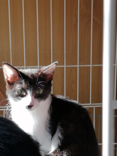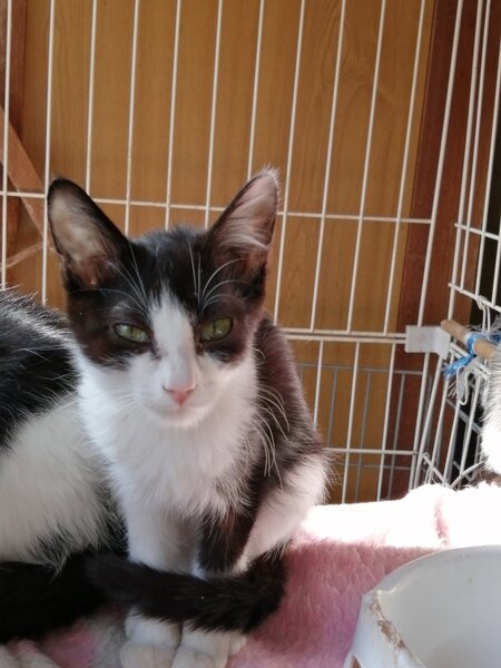 | 特徴(性格など) | 5人兄弟の子猫です。現在3匹保護しています。性別はメス1匹、オス2匹です。毛色は白と黒の2色です。推定で8月生まれ、生後5ヶ月です。性格は人懐こいです。保護された昨年10月は母猫と一緒にシャーシャーと威嚇していましたが、今は人に良く慣れてきました。 | ||