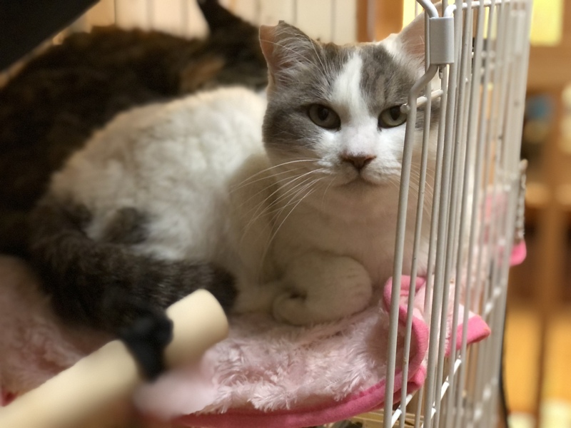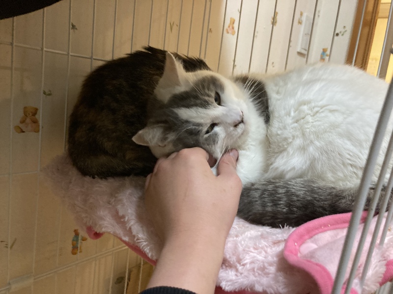 | 特徴(性格など) | おっとりした性格で、なでられることが大好きです。 白×グレーの毛色で、ふわふわの毛並みが自慢です! 太めのしっぽもチャームポイント。 TNRの際に耳カットしています。 家猫修行中ですが、保護する前の餌やりさんにはよく懐いていました。 同時に保護された猫ちゃんとも、仲良く過ごしています。 |