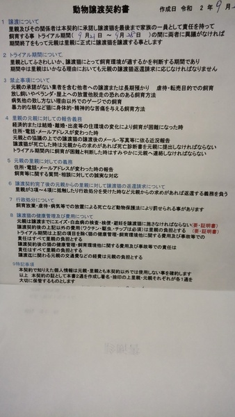 | その他(譲渡条件など) | 賃貸の場合はペット可の証明が必要です。65歳以上の方は飼養保証人が必要です。譲渡の際は里親さまの自宅にて手渡し致します。 譲渡契約書にサインお願いします。 |