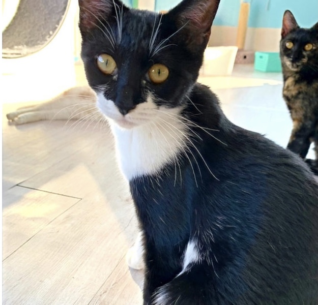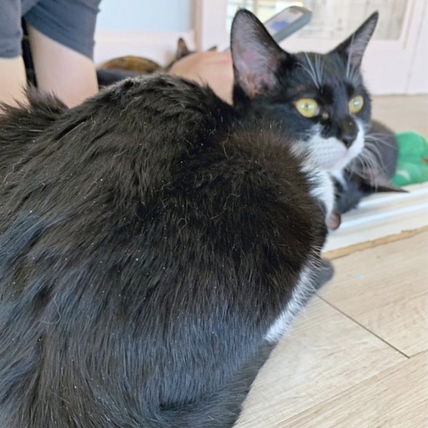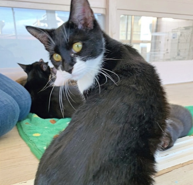 | 特徴(性格など) | 2021年5月生まれの女の子です。 甘えん坊でよくお客様の膝に乗って寝ています。 でもこちらから構わないと来ないなど、空気の読める白黒女子です。 もともと6兄弟の一匹で、猫同士でも慣れていて、遊ぶことが大好きな子です。 だっこ○、爪切り○、膝のり○です。 |