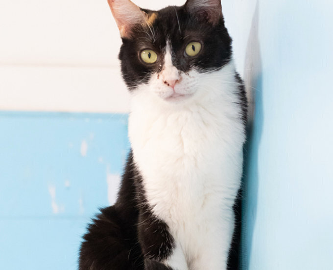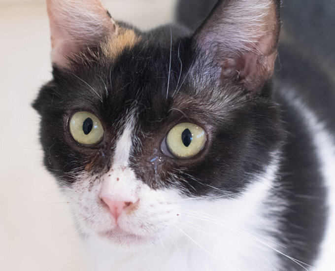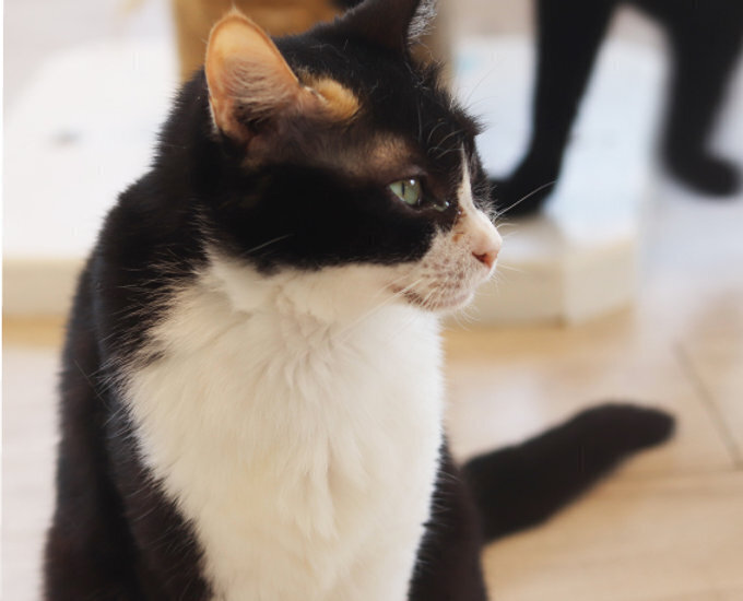 | 特徴(性格など) | 警戒心が強く、なでなでは基本NGですが、機嫌がいいときはお尻だけならOKですが時間制限ありです。ただ目つきは少し和らいできました。 毛がふわふわで一見黒白に見えますが、実は三毛猫。 名前の由来もそこからです。 |