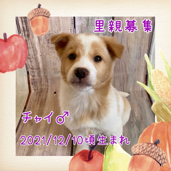 | 特徴(性格など) | 白薄茶色、体重2.6kg(1/19測定) おでこにあるハートマークの模様がチャームポイントなチャイ君。 きょうだいと元気に遊びまわっています。 トイレはほぼ完璧にシートで出来ていますが、たまにシート以外でしてしまうことがあります。トイレをしそうだなと思ったらシートへ誘導してあげるなど、引き続きトレーニングをお願いします。 1日4回ごはんを食べていることなど、子犬なのでお留守番の短いご家庭を希望します。 |