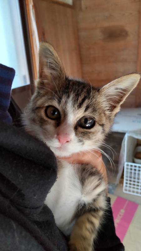 | 里親募集する理由 | 昨年10月に敷地内で保護する。 低体温症で入院回復し今は元気。 過去に保護している猫3匹中1匹が先天性脳障害の為、トイレを覚えずほぼオムツ状態。水は自分で飲めないので、シリンジ強制給水。 先住猫たちの世話などで時間的余裕が無く…里親募集する事になりました。 |