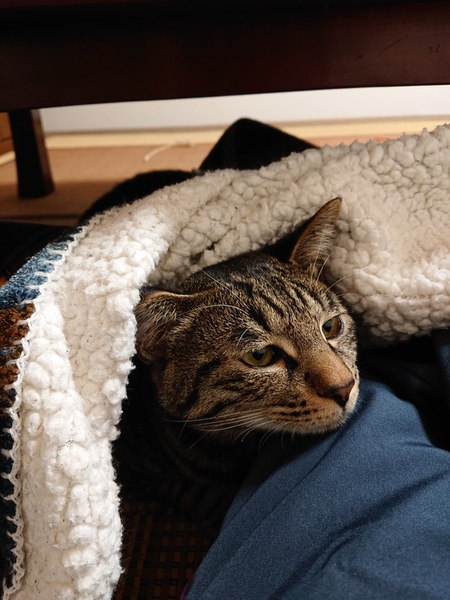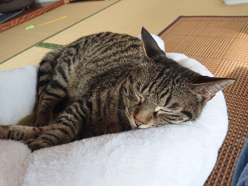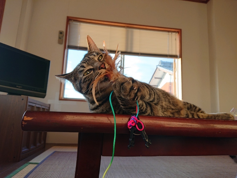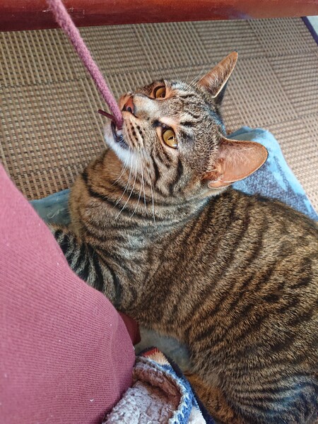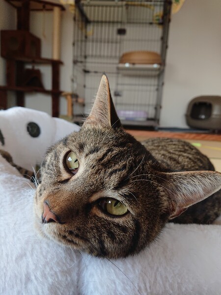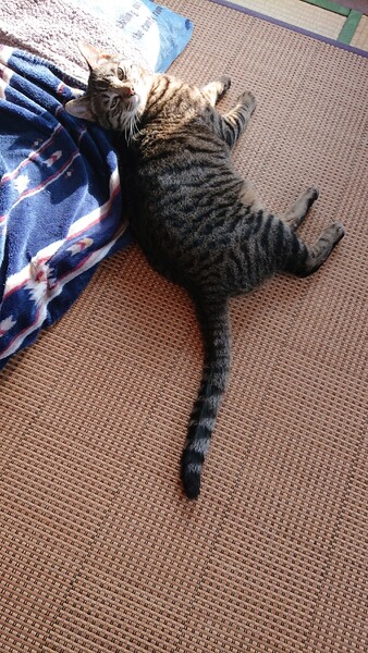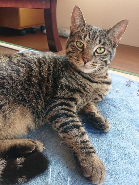 | 特徴(性格など) | 尾巻き猿?と思うくらい、シッポが非常に長い(30cmほど)キジトラの男の子です。 保護当時は人が怖くてビクビクしていましたが、今では抱っこもでき、撫でてもらいたくてそばに寄ってきたり、膝の上に乗って上着の中に潜り込む甘えん坊です。ほかの兄弟のご飯を盗み食いする食いしん坊でもあります。 ちょっとボヤッと感はありますが、裏を返せば何をされても怒らない温厚な子です。 テンションが上がるとおもちゃに向かっていって大ジャンプを繰り返します。 骨太なので少し大きくなるかもしれません。 2021年4月生まれです。 |