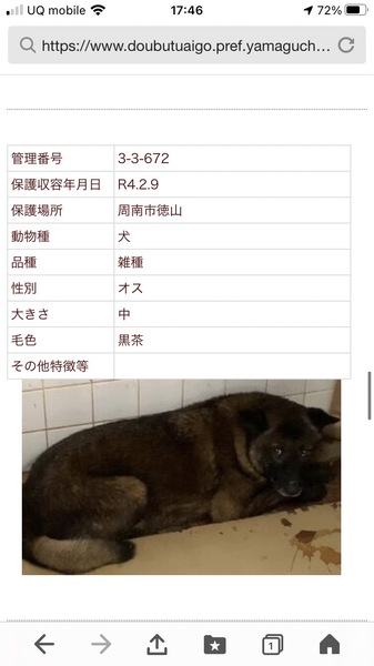 | 特徴(性格など) | 毛色…黒茶 唸りも威嚇もなく怯えています |