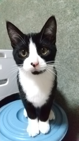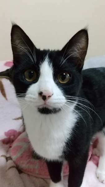 | 特徴(性格など) | 白と黒のタマ模様、足先は白タビを履いています。しっぽは長いです。人も猫も大好き、元気いっぱいな男の子です。 エイズ、白血病ともに陰性です(2022年3月5日の去勢手術前の血液再検査にて確認済み)。 |