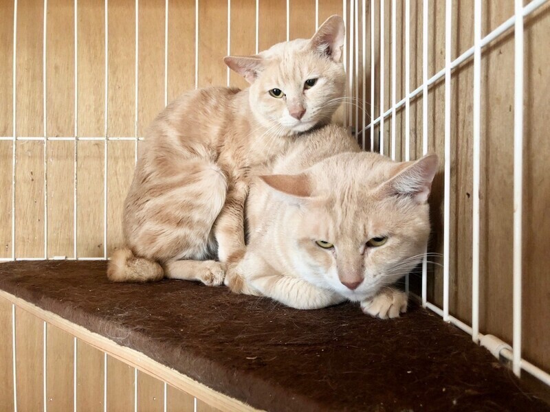 | 特徴(性格など) | 二匹ともとても元気で仲良く過ごしています(^^) チュールをあげると手を伸ばして取ろうとするなど物怖じせず無邪気!二人で交互に食べあってカワイイです♪ミルクティーのような毛色もとてもきれいですよ。 元気に過ごしています♪ ・ノミダニ回虫駆除済み ・エイズ(−)白血病(−) ・3種混合ワクチン接種済み |
