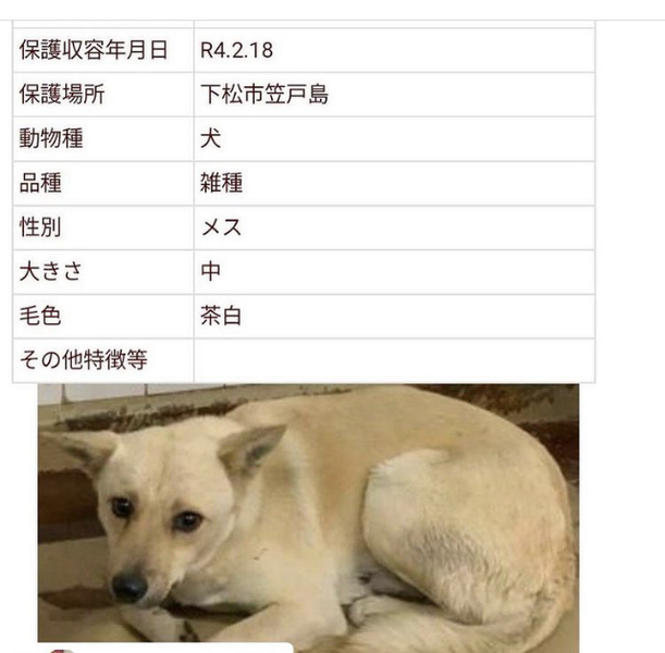 | 性別 | 犬 ♀ | 年齢 | 推定5歳0ヶ月 (2026/03/18 現在 ) |