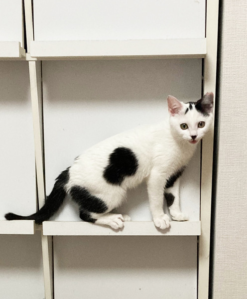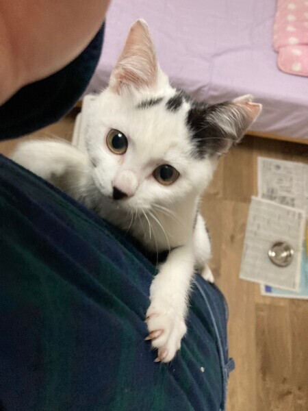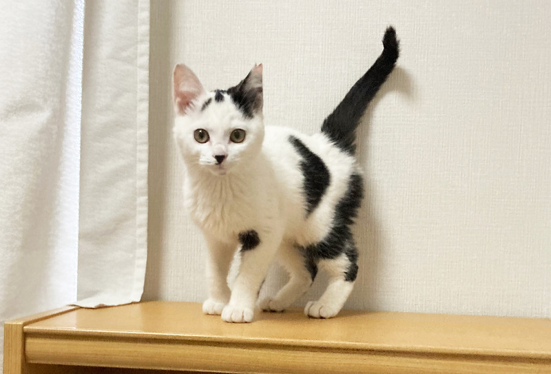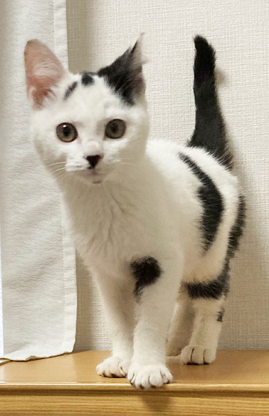 | 特徴(性格など) | 白黒 人懐っこく好奇心旺盛。身近なものを何でもおもちゃにして遊んでます。 |