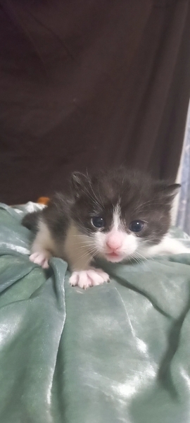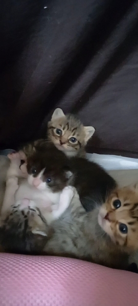 | 特徴(性格など) | キジトラ(女の子) キジトラ(男の子、顔白) キジトラ(男の子、やや毛がながめ) ハチクロ(男の子) 同じ箱にいたと思われるので兄妹かと思われます。 離乳前ですが、元気にミルクを飲んでいます。 生後一月くらいの大きさで、離乳食に慣らしてトイレを覚えさせてから譲渡できたらと思っております。 |