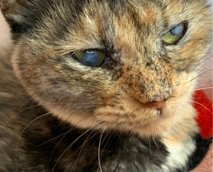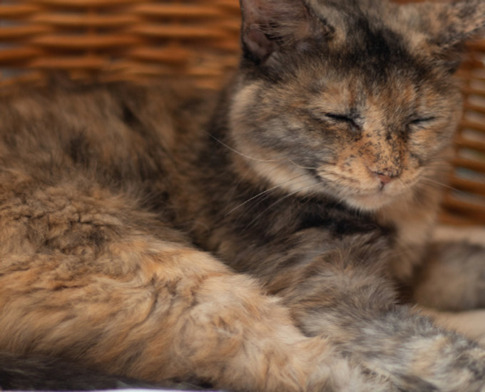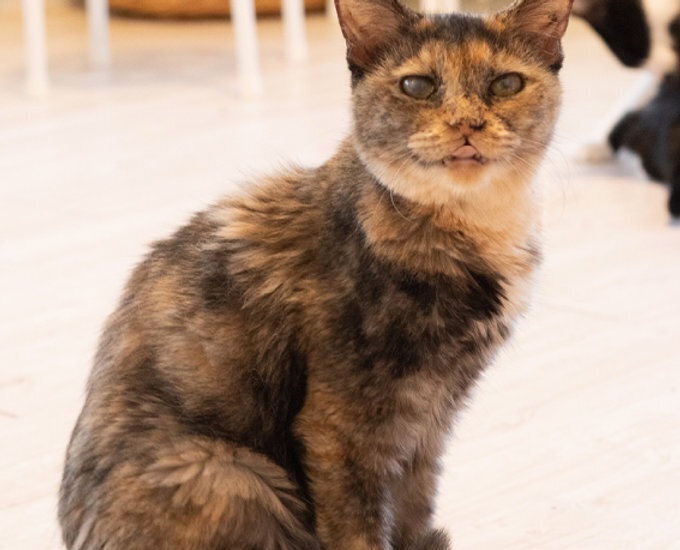 | 特徴(性格など) | 2015年生まれの女の子です。 両目に白濁があります。 茶トラの下地に薄く黒をまぶしたような、少し変わったさび猫です。 以前は高いところから下界を見物していましたが、最近昼間はふれあいルームのボックスで寝ていることが増えました。しっぽはまっすぐ。小柄で可愛い女の子です。 だっこは苦手ですが、寝ている時は少し触れます。 少しお腹が弱めです。 だっこ×、爪切り×、膝のり×です。 |