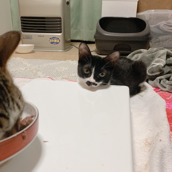 | 特徴(性格など) | 黒白のおひげ模様のメス猫です。 | ||