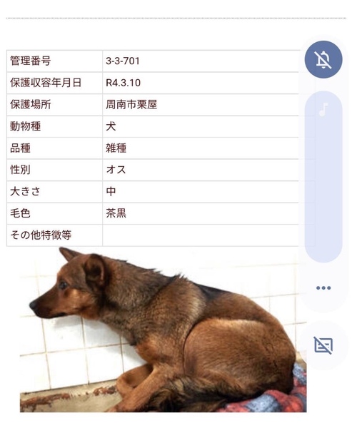 | 特徴(性格など) | 毛色…濃い茶色(茶系) 唸り威嚇はありません この状況を感じているのか無気力に見えます オヤツを鼻につけても舐めることもなく体を折り曲げただじっと座ったままの姿勢は胸を締めつけられます |
