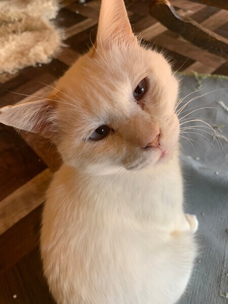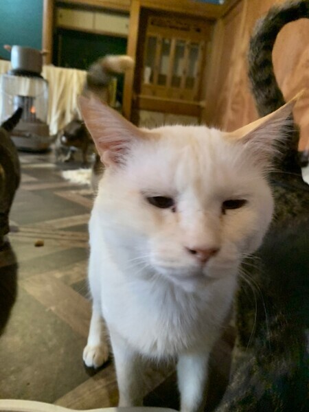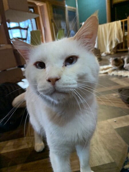 | 特徴(性格など) | 保護施設からの里親様募集です。 山手で他の猫ちゃんたちと暮らしていた元々野良ちゃんです。山の神様みたいに不思議で魅力的な風貌!全体的に白猫ですが、茶クリーム色が耳元などにあしらわれています。 目は白っぽいブルー色で寄り目ちゃん。 性格は非常に温厚で見た目と性格からスタッフに「山神様」とニックネームつけられています(^^) 甘えん坊さんなのにマイペースで天然キャラさんです。 過去に怪我をしたのか、若干前左足の手首を庇う感じで歩く事があります。 飼いやすいです!高齢者様宅、お子さん宅、猫初心者様お勧めです! |