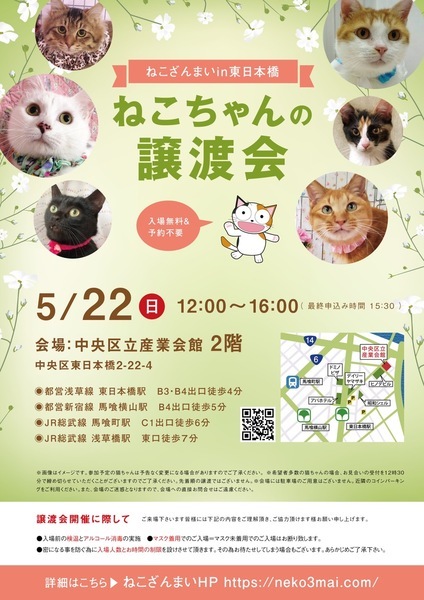 | その他(譲渡条件など) | 11:30より、2階会場入口にて受付を開始します。 受付時に入場予定時間が記入された整理券をお配り致しますので、整理券を受け取った方はお時間になりましたら2階会場入口に番号順にお並び下さい。 ※11:30より早くいらしてもお待ちいただく場所がございません。 また、近隣にお住まいの方や他階フロアのご利用者様にご迷惑となる場合がございますので、受付開始時間にあわせてお越しくださいますよう、何卒ご協力お願いいたします。 ※ねこざんまい譲渡会は、先着順で里親様を決定する譲渡会ではありません。 先に申し込みをした方を優先することもありません。 お話をして、その猫ちゃんに合ったおうちに決めさせていただいております。 12時に開場し、里親様の決定は14時以降となります。 14時以降にご入場の場合、希望の猫ちゃんが決定している可能性があります。 また1頭に対し多数のご希望をいただいた場合、早めに申し込みを締め切らせていただく場合がございますので、予めご了承下さい。 里親様決定は14時以降となります。 その後、迎え入れ準備の説明等のお時間も頂戴しますので、お時間に余裕を持ってご来場下さい。 【新型コロナウィルス感染予防対策について】 譲渡会開催に際し、ご来場下さいます皆様には以下の内容をご理解頂き、ご協力頂けます様お願い申し上げます。 ●入場前の検温とアルコール消毒の実施 ●マスク着用でのご入場=マスク未着用でのご入場はお断り致します ●入場人数の制限をさせていただきます(来場多数の場合は入れ替え制となります) ●時間と人数の制限=密になる事を防ぐ為に入場人数とお時間の制限を設けさせて頂きます その為お待たせしてしまう場合もございます ●会場利用規約により、ご来場者様の連絡先を控えさせていただきます あらかじめご了承下さい。 諸々の制限がございますが、安心・安全な譲渡会運営のためにご理解・ご協力いただきますようお願い申し上げます。 ~~~~~~~~~~~~~~~~~~~~~~~~~~~~~~ ★仔猫ご希望の里親様★ 仔猫ちゃんたちは、まだ体がしっかりしていない赤ちゃんです。 下痢だけでも数時間対応ができなかっただけ死に至る事もあります。 その為、月齢に応じたお留守番時間を設けさせていただいております。 また、子猫ちゃん(6ヶ月未満)の里親様には子猫支援金のご協力をお願い致しております。 ★猫ちゃんとのお見合いは譲渡会で!★ ねこざんまいの猫ちゃんは譲渡会でのお見合いのみとなります。 『この子はいつ譲渡会に参加するの?』『譲渡会場の場所はどこ?』などは、ねこざんまいホームページをご覧ください。 https://neko3mai.com/ ★楽しく猫ちゃんと触れ合って★ ねこざんまい譲渡会は、猫ちゃんも里親様も保護主も笑顔で過ごせる譲渡会を目指しています。 これから20年以上、楽しい時も、悲しい時もいつも傍にいてくれる大切な家族になる猫ちゃんです。 会場には沢山の猫ちゃんがいます。 1匹1匹、触れ合って猫ちゃんとお話してください。 『初めて猫ちゃんを家族に迎える方』 『先住猫ちゃんのお友達を迎える方』など トライアルの仕方や先住猫ちゃんと仲良くなるコツなど経験豊富な保護主やスタッフにお気軽にご相談ください! 猫を愛し、そして猫に愛されている猫好きスタッフと保護主がアドバイスさせていただきます。 ★里親希望のみなさまへ★ ペットではなく、家族一員としてたっぷり愛情を注いでくださるご家庭をお待ちしております。 恐れ入りますが ●学生の方、子猫・幼猫希望の60才以上の方のみのご家庭 ●脱走防止対策にご協力いただけない方 は原則譲渡を遠慮させていただいております。 ●一人暮らし・同棲(事実婚)の方 保護主の希望や猫の年齢・性格等により、ご希望に添えない場合もございます。 参加猫ちゃんは、それぞれ保護主(実際に猫ちゃんを自宅に入れ、保護をしている方)が異なります。 詳しい条件なども異なる場合がございますので、会場内で直接保護主とお話ください。 〖共通条件〗 1.終生飼育 2.完全室内飼い 3.脱走防止対策へのご協力 4.避妊去勢手術 5.契約書類へのサイン 6.定期報告 7.医療費等の負担 当日の猫ちゃんを連れて帰ることはできません。後日、保護主が里親様のご自宅までお届け致します。 その為、移動の際の猫ちゃんの負担を月齢などから考慮し、お届け地区を限定させて頂くこともございますのでご了承ください。 ご理解とご協力のほど宜しくお願い致します。 ☆よくある質問☆ ・譲渡の条件 ・ご負担頂く費用 ・譲渡会の場所等は ホームページに詳しく掲載させて頂いておりますのでご覧ください。 https://neko3mai.com/ メールでのお問い合わせはすぐにご返答出来ない場合がございますのでご了承ください。 ホームページ https://neko3mai.com/ お問い合わせ http://www.neko3mai.com/contact/form_general.html ねこざんまいブログ http://ameblo.jp/neko3mai/ |
