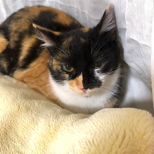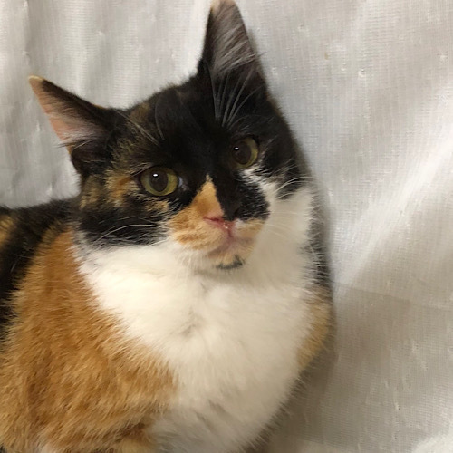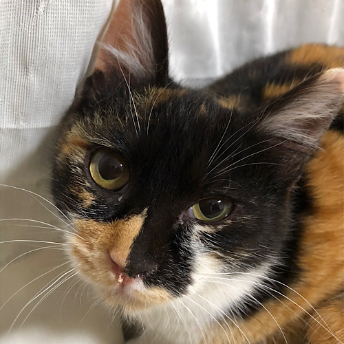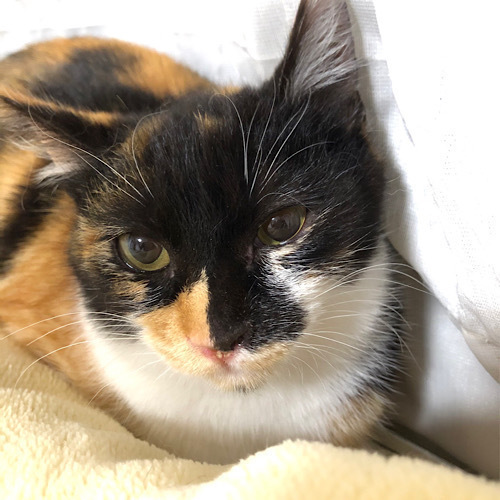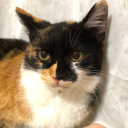 | 特徴(性格など) | 保護した時が少し遅かったため、まだ人慣れ修行中の気が強い三毛ちゃんです。 最近は顔の横や顎の下を撫でると気持ちよさそうにします。 活発でよく動く方です。 母猫ちゃんは事故か虐待である日、避妊手術のため、探していた時にある家の庭先で血を吐いて亡くなっていました。 母猫の分も幸せになってほしいです。 |