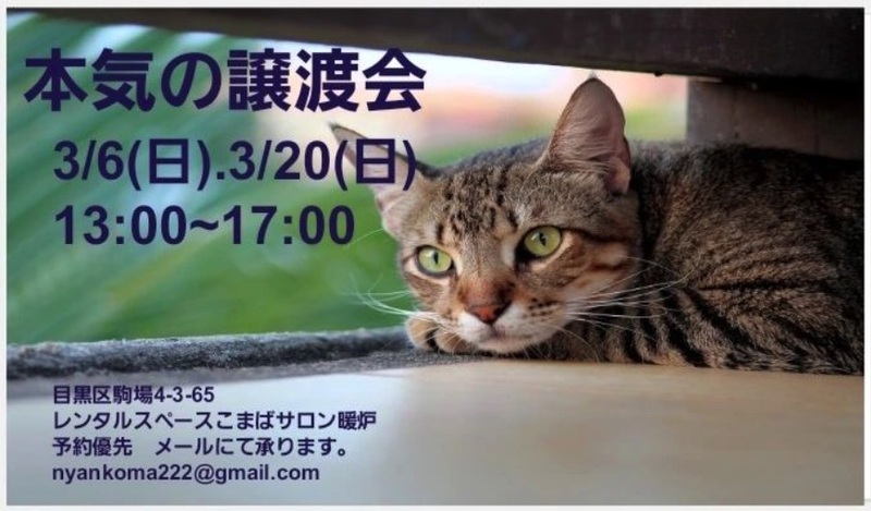| 特徴(性格など) | ▼△▼譲渡会参加情報▼△▼ 2022/3/20(日)13:00~17:00 こまばサロン暖炉〜本気の譲渡会〜 1時間交代の予約優先制。 https://www.instagram.com/p/Ca2B9OjJU_H/?utm_medium=copy_link https://www.facebook.com/nyankomaba/events/ 主催:保護猫譲渡会カフェ こまばサロン暖炉 ※主催者様のサイトを必ずご確認くださいますようお願いいたします。 【予約方法】主催者様宛メール予約 nyankoma222@gmail.com ●お名前 ●人数 ●会いたい猫の名前 ●時間(①13:00~②14:00~③15:00~④16:00~) 上記をご記入のうえご予約ください。 【会場】東京都目黒区駒場4-3-65 レンタルスペースこまばサロン暖炉 ▼△▼△▼△▼△▼△▼△▼ 推定生年月日:2021年4月 しっぽ:長くてまっすぐ まだ1才の男の子です! 兄弟猫・チャンプといっしょに保護され、 中猫というより、まだまだ子猫のあどけなさ満載の甘えん坊! カジカジ甘噛みも上手です。 ☆不妊去勢手術済 ☆ワクチン(2回)済 ☆ノミダニ取り済 ☆駆虫(2回)済 ☆マイクロチップ挿入済 ☆トイレトレーニング済 ☆ウイルス検査 エイズ(ー)白血病(ー) |
