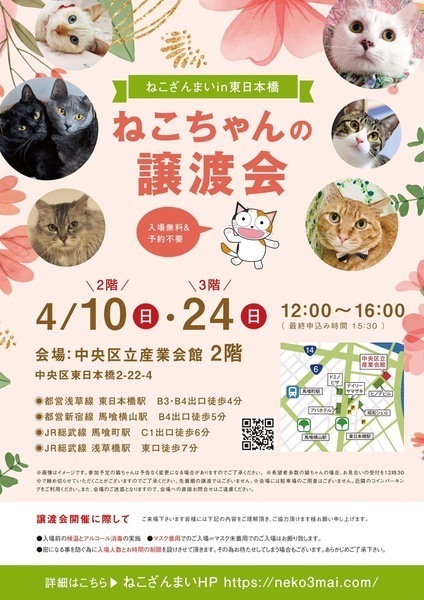 | その他(譲渡条件など) | 11:30より、3階会場入口にて受付を開始します。 受付時に入場予定時間が記入された整理券をお配り致しますので、整理券を受け取った方はお時間になりましたら3階会場入口に番号順にお並び下さい。 ※11:30より早くいらしてもお待ちいただく場所がございません。 また、近隣にお住まいの方や他階フロアのご利用者様にご迷惑となる場合がございますので、受付開始時間にあわせてお越しくださいますよう、何卒ご協力お願いいたします。 ※ねこざんまい譲渡会は、先着順で里親様を決定する譲渡会ではありません。 先に申し込みをした方を優先することもありません。 お話をして、その猫ちゃんに合ったおうちに決めさせていただいております。 12時に開場し、里親様の決定は14時以降となります。 14時以降にご入場の場合、希望の猫ちゃんが決定している可能性があります。 また1頭に対し多数のご希望をいただいた場合、早めに申し込みを締め切らせていただく場合がございますので、予めご了承下さい。 里親様決定は14時以降となります。 その後、迎え入れ準備の説明等のお時間も頂戴しますので、お時間に余裕を持ってご来場下さい。 【新型コロナウィルス感染予防対策について】 譲渡会開催に際し、ご来場下さいます皆様には以下の内容をご理解頂き、ご協力頂けます様お願い申し上げます。 ●入場前の検温とアルコール消毒の実施 ●マスク着用でのご入場=マスク未着用でのご入場はお断り致します ●入場人数の制限をさせていただきます(来場多数の場合は入れ替え制となります) ●時間と人数の制限=密になる事を防ぐ為に入場人数とお時間の制限を設けさせて頂きます その為お待たせしてしまう場合もございます ●会場利用規約により、ご来場者様の連絡先を控えさせていただきます あらかじめご了承下さい。 諸々の制限がございますが、安心・安全な譲渡会運営のためにご理解・ご協力いただきますようお願い申し上げます。 ~~~~~~~~~~~~~~~~~~~~~~~~~~~~~~ ★仔猫ご希望の里親様★ 仔猫ちゃんたちは、まだ体がしっかりしていない赤ちゃんです。 下痢だけでも数時間対応ができなかっただけ死に至る事もあります。 その為、月齢に応じたお留守番時間を設けさせていただいております。 また、子猫ちゃん(6ヶ月未満)の里親様には子猫支援金のご協力をお願い致しております。 ★猫ちゃんとのお見合いは譲渡会で!★ ねこざんまいの猫ちゃんは譲渡会でのお見合いのみとなります。 『この子はいつ譲渡会に参加するの?』『譲渡会場の場所はどこ?』などは、ねこざんまいホームページをご覧ください。 https://neko3mai.com/ ★楽しく猫ちゃんと触れ合って★ ねこざんまい譲渡会は、猫ちゃんも里親様も保護主も笑顔で過ごせる譲渡会を目指しています。 これから20年以上、楽しい時も、悲しい時もいつも傍にいてくれる大切な家族になる猫ちゃんです。 会場には沢山の猫ちゃんがいます。 1匹1匹、触れ合って猫ちゃんとお話してください。 『初めて猫ちゃんを家族に迎える方』 『先住猫ちゃんのお友達を迎える方』など トライアルの仕方や先住猫ちゃんと仲良くなるコツなど経験豊富な保護主やスタッフにお気軽にご相談ください! 猫を愛し、そして猫に愛されている猫好きスタッフと保護主がアドバイスさせていただきます。 ★里親希望のみなさまへ★ ペットではなく、家族一員としてたっぷり愛情を注いでくださるご家庭をお待ちしております。 恐れ入りますが ●学生の方、子猫・幼猫希望の60才以上の方のみのご家庭 ●脱走防止対策にご協力いただけない方 は原則譲渡を遠慮させていただいております。 ●一人暮らし・同棲(事実婚)の方 保護主の希望や猫の年齢・性格等により、ご希望に添えない場合もございます。 参加猫ちゃんは、それぞれ保護主(実際に猫ちゃんを自宅に入れ、保護をしている方)が異なります。 詳しい条件なども異なる場合がございますので、会場内で直接保護主とお話ください。 〖共通条件〗 1.終生飼育 2.完全室内飼い 3.脱走防止対策へのご協力 4.避妊去勢手術 5.契約書類へのサイン 6.定期報告 7.医療費等の負担 当日の猫ちゃんを連れて帰ることはできません。後日、保護主が里親様のご自宅までお届け致します。 その為、移動の際の猫ちゃんの負担を月齢などから考慮し、お届け地区を限定させて頂くこともございますのでご了承ください。 ご理解とご協力のほど宜しくお願い致します。 ☆よくある質問☆ ・譲渡の条件 ・ご負担頂く費用 ・譲渡会の場所等は ホームページに詳しく掲載させて頂いておりますのでご覧ください。 https://neko3mai.com/ メールでのお問い合わせはすぐにご返答出来ない場合がございますのでご了承ください。 ホームページ https://neko3mai.com/ お問い合わせ http://www.neko3mai.com/contact/form_general.html ねこざんまいブログ http://ameblo.jp/neko3mai/ |