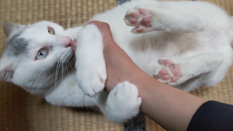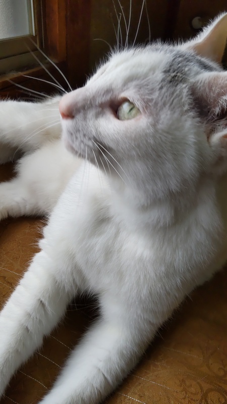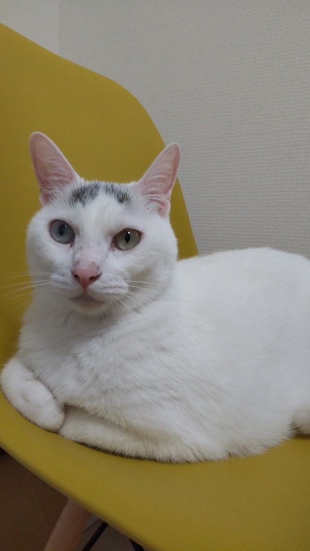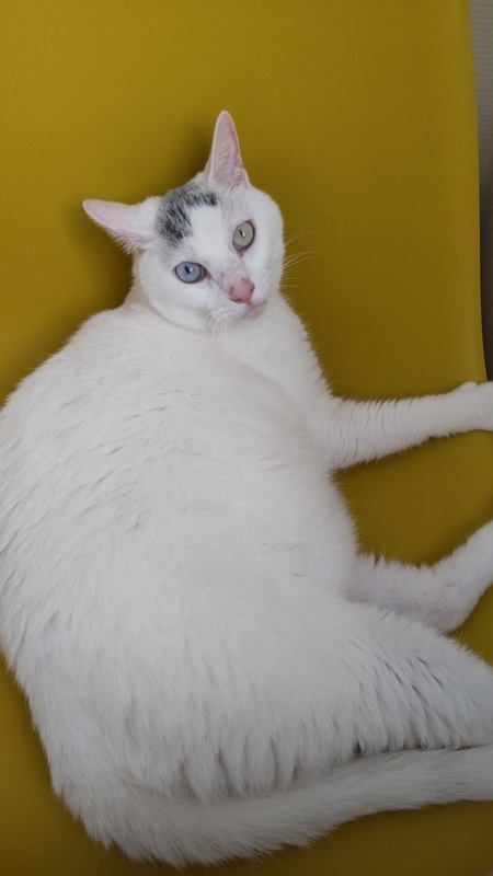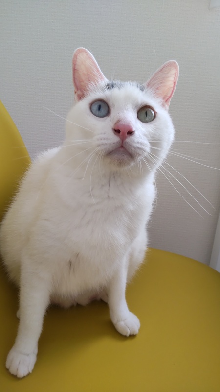 | 特徴(性格など) | 人間が大好きで、人見知りせずスリスリ寄ってきて甘えてくれます。他の猫とも仲良くできます。 頭以外は全身白色、オッドアイの男の子です。 怒ったりシャーと言ったところを見たことがありません。じゃれてきても、爪を立てません。 |