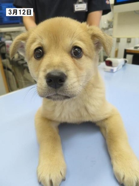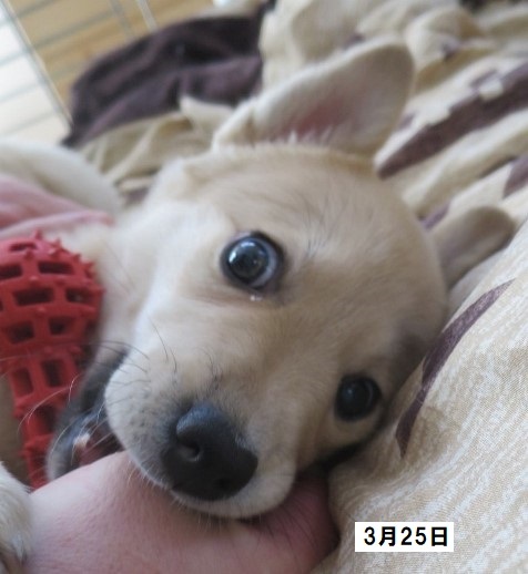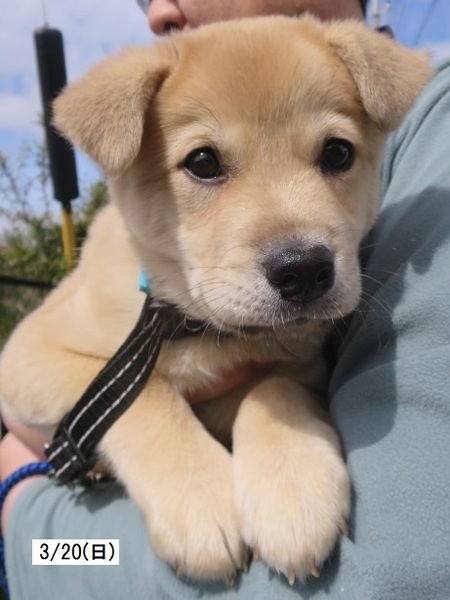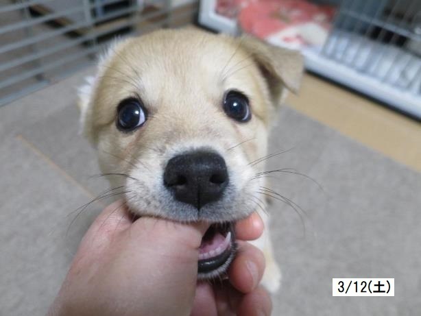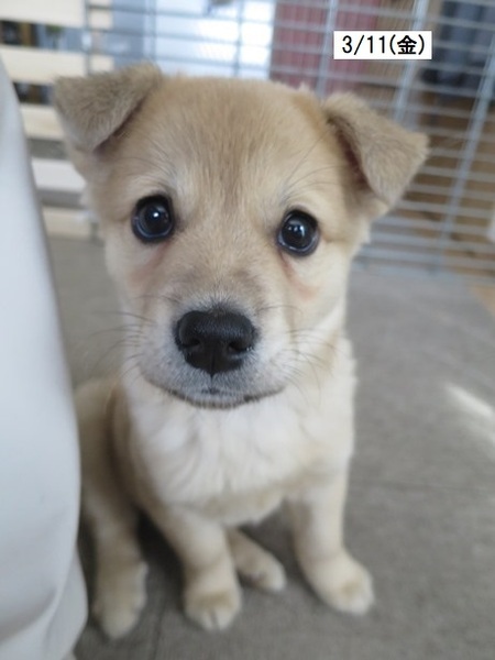 | 特徴(性格など) | ザ・子犬さまの「まめた」です。 1回目ワクチン接種済(2回目は4月9日予定)、ノミダニ駆除済、回虫駆虫済。未去勢。 親や兄弟と育ったからか、人も犬も大好きな健康優良児でとても素直な子犬です。 食欲旺盛、快便快眠で日々成長しています(3月27日現在5.2kg)。将来的には結構大きくなると思われます。 やんちゃで元気いっぱい、甘噛みは力強く、遊び相手をするのは体力が要りますが、月齢のわりに落ち着いた印象で、話しかければ目をじーっと見てくれます。 周りをよく見ており人に集中できるコなので、しつけはし易いかと思います。 大らかで基本おっとりしており、大きな物音や衝撃にあまり動じません。 周囲を観察できる分、慎重なところは少しありますが、ビビりな要素はありません。 トイレの失敗はありませんが、退屈になるとトイレシーツをかじって遊び始めるあたりはまだまだ子犬という感じがします。 同居の猫にはとてもフレンドリーで相手をしてもらえると大喜びしていますが、あたりが強く、加減がまだ分からないようで猫にはよく怒られています。 ワクチンがまだ1回しか済んでいないため散歩に出られませんが、お外が大好きなコになると思います。 車酔いは今のところ見られません。運転中はキャリーの中でおとなしくしています。 まだ幼いので留守番がなるべく無く(少なく)、たくさんの愛情をかけて下さるご家庭を希望します。 ●預かりブログ https://blog.goo.ne.jp/tkshrk1013 |