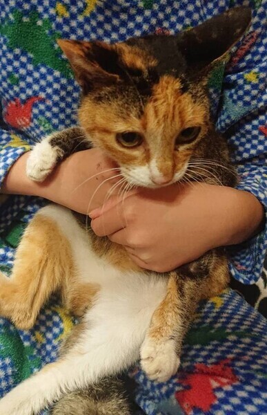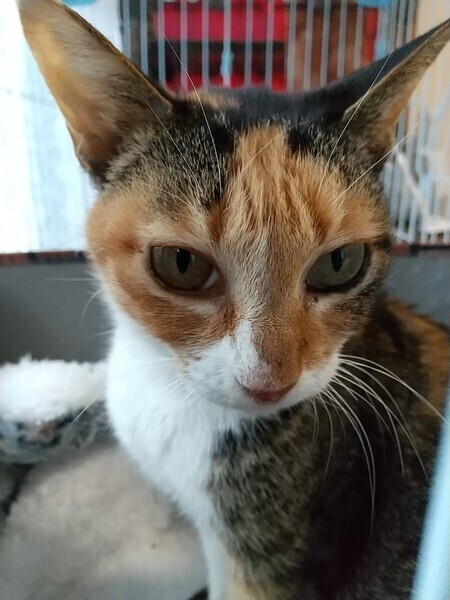 | 特徴(性格など) | 2022年2月に保護されました。 濃い三毛で目力は抜群です。 大人の猫ですが猫エイズが陽性です。発症はしていません。 (※ 猫エイズは咬傷で感染します。猫エイズウイルスは感染力の強い病原体ではないので、空気感染や接触感染はしません。) 5歳くらいで、体は小さめの子。 性格は大人しく、少し怖がりですが人には懐っこいです。 |