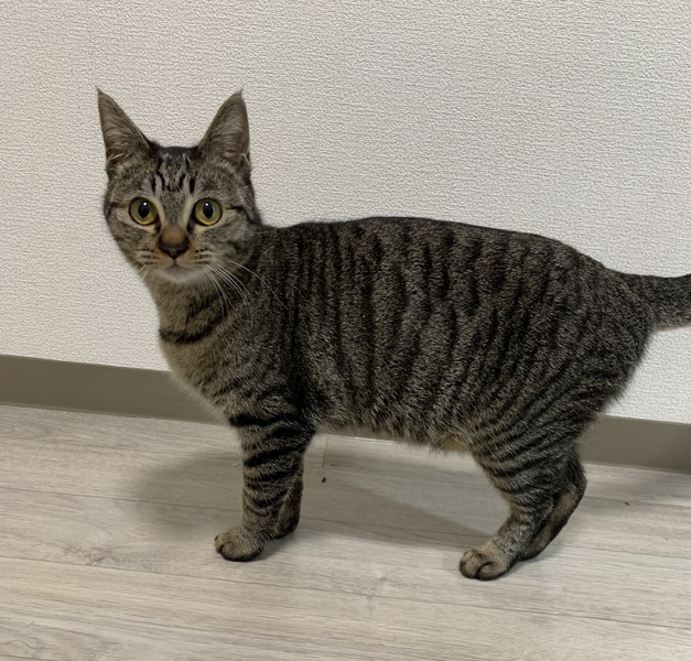 | 特徴(性格など) | 毛色:黒色、ぐれー(サバトラ) 性格:マイペース、好奇心旺盛。高いところ、おもちゃで遊ぶのが大好き。 |