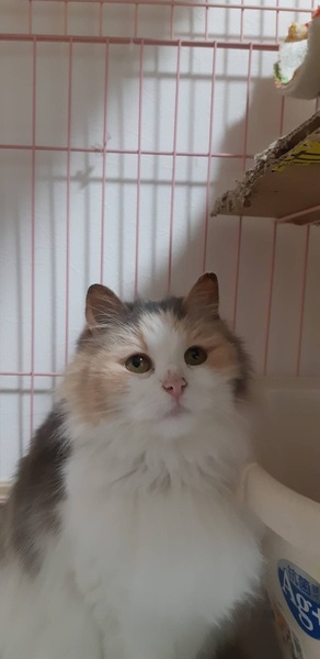 | 特徴(性格など) | 名前:エイミー 女の子 マンチカン長毛 毛色:キャリコ とっても穏やかで手がかかりません。初めは人見知りをしますがすぐに慣れてくれました。本来明るい猫種なので慣れたら可愛い猫さんになると思います。 不妊手術済 3種混合ワクチン 猫エイズ・白血病検査:陰性 マイクロチップ装着 検便:陰性 子宮水腫になっていて血尿みたいなものが出ていましたが不妊手術で子宮摘出をしたので予後良好です。 食が細く痩せ気味ですが、ドライフードにウエットを混ぜて食べてもらっています。健康上問題はありません。 |