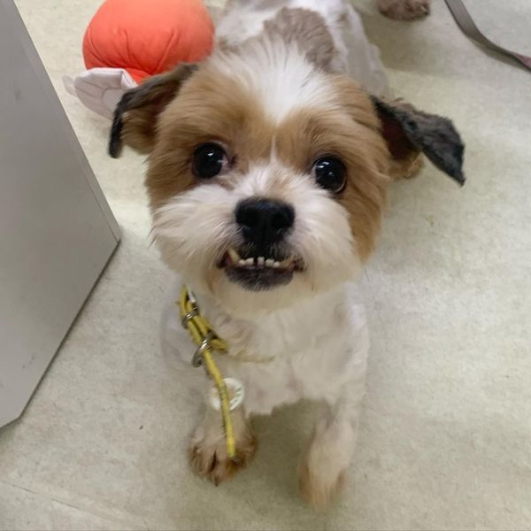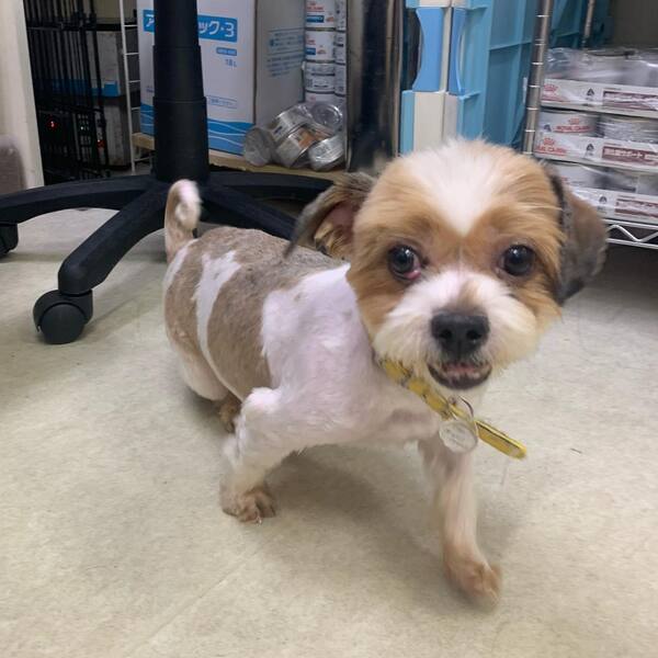 | 特徴(性格など) | とても人なつこく後追いします。 シーズー系のミックス犬です。レスキュー時、排泄物の付着がひどく、全身丸刈りをせざるを得なかったのですが、将来は毛が伸びでかわいくカットを楽しめる子です。 噛むことはありません。 ご飯は大好きでなんでもよく食べます。 下顎が出ているところも愛嬌いっぱいです。 |