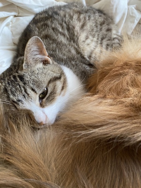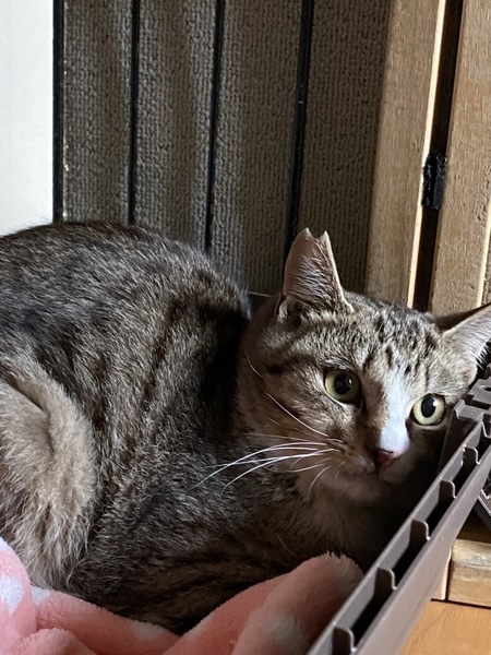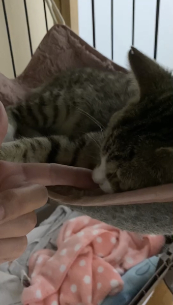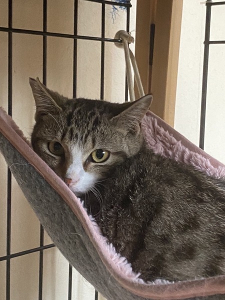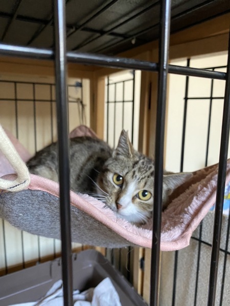 | 特徴(性格など) | キジ白模様の男の子です。まだ、人馴れ修行中ですが、撫でるとゴロゴロして指に付けたちゅーるも舐めてくれます。保護宅にて犬も居ますが、近くに寄り添って寝るようになり、犬が居るお家でも大丈夫かなと思います。 | ||
