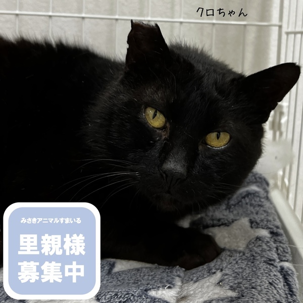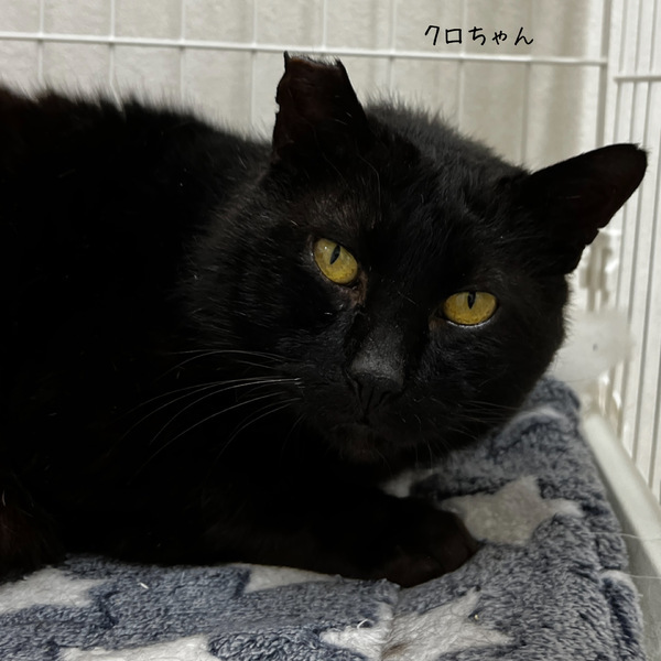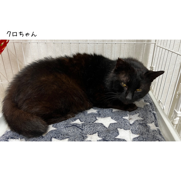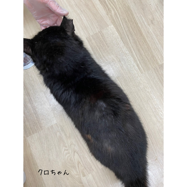 | 特徴(性格など) | 仮名:クロちゃん ・オス ・推定8歳位 ・去勢手術済 ・猫エイズ陽性 ・背中と頭に傷を負っていたところ保護し、手術しました 傷のところもしっかり毛が生えてきました 【性格】 元野良猫とは思えないほどいつもゴロゴロすりすりしてきてくれます おひざにも乗ってきてくれる甘えんぼちゃんでとてもかわいいです? 猫ちゃん達からも大人気です |
