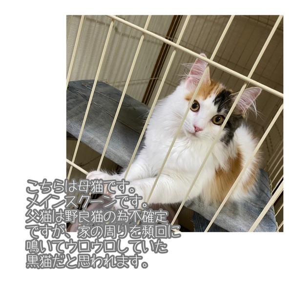 | 里親募集する理由 | 不妊治療未のメス猫が家出してしまい、家出中に野良猫と交配していた為子供を授かり出産したが、現在の飼育環境的に子猫を育てていくのが困難な為里親募集をさせて頂きます。 | ||