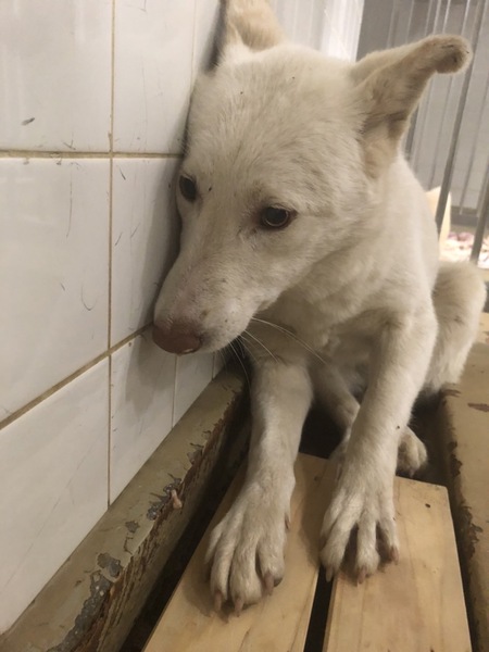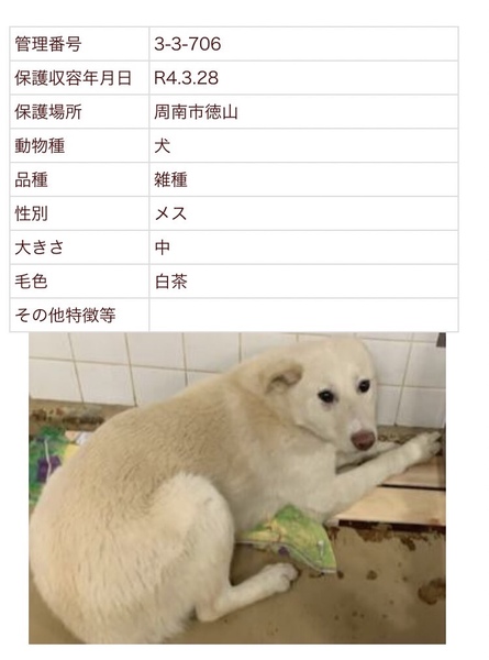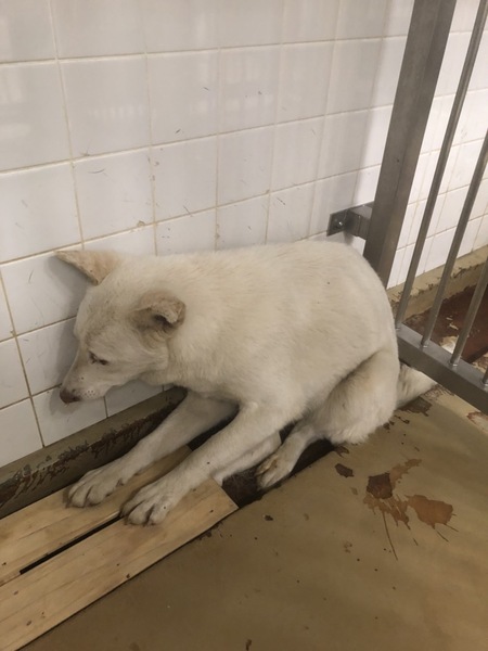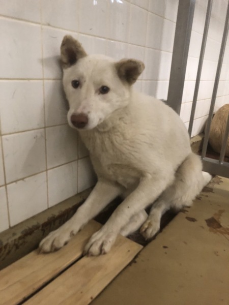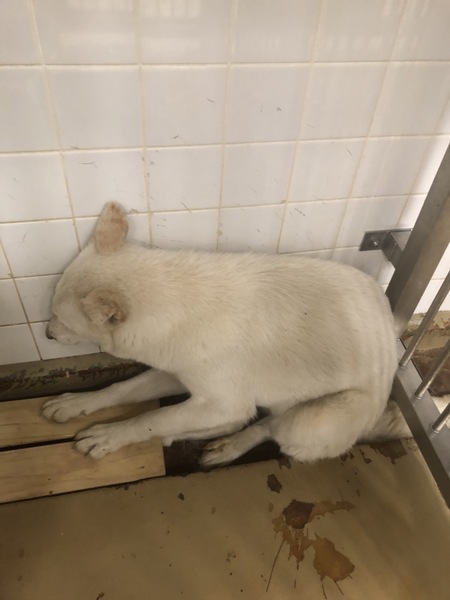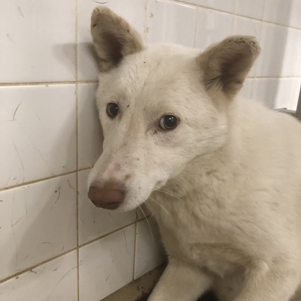 | 特徴(性格など) | 毛色…白 威嚇も唸りもありません ただただ怯えています 可愛いお顔の女の子です 15〜18キロくらい |
