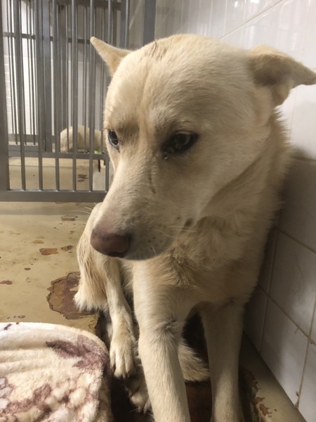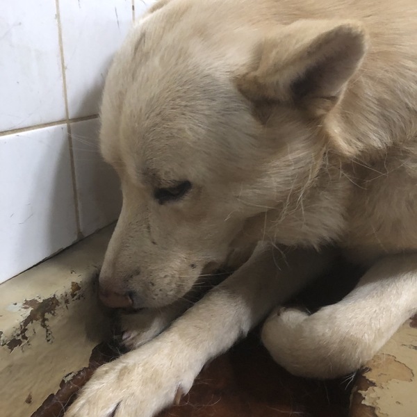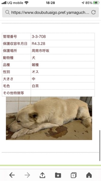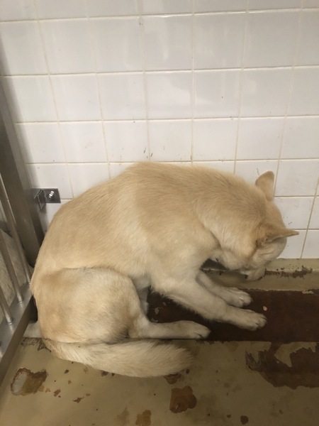 | 特徴(性格など) | 毛色…薄茶、白 怯えていますがオヤツを食べてくれました 20キロ近くありそうです 触らせてくれました |