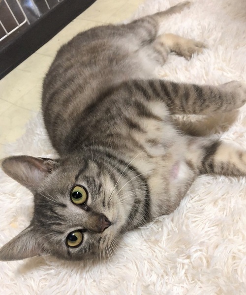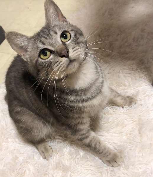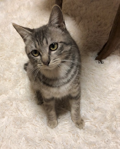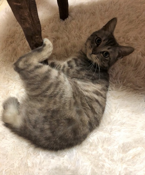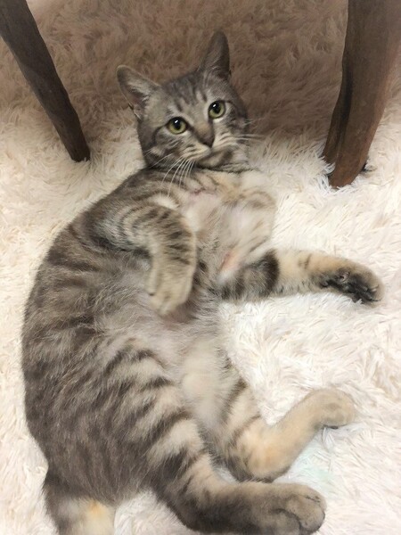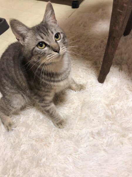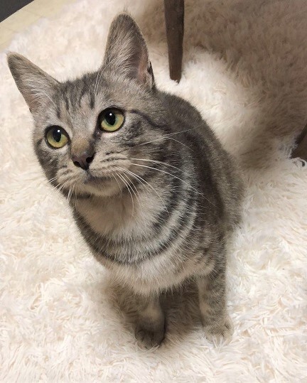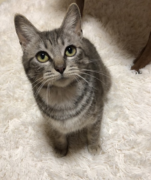 | 特徴(性格など) | たれ目・まん丸顔・少しアッシュがかったグレーしましま男の子 環境が変わるとしばらく慎重な性格になります。 ご飯のお皿が出ただけで「ゴロゴロ~」」ふみふみ~の、ちょっとした苦労人です。 オモチャで遊ぶ時は、本当に一生懸命、、、 両方の手を同時に出し顔も最速で右左~ 動きが面白い子です。 キジトラ女の子「にゃー子」と兄妹です。 |